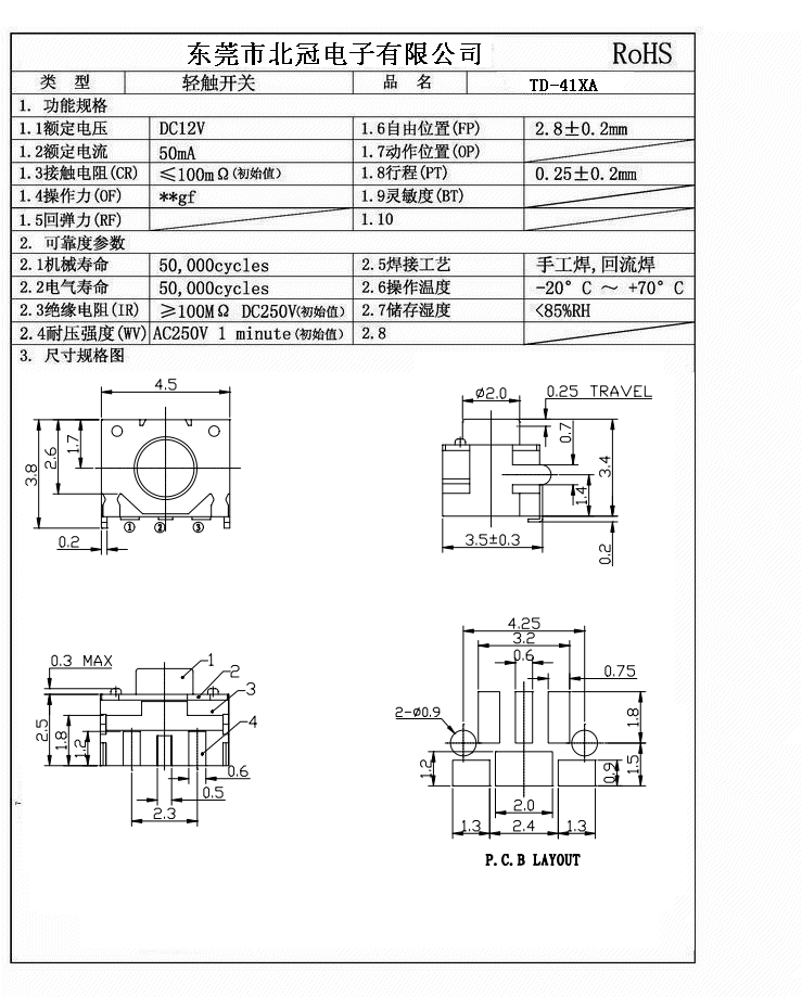 3.Lnsulation Resistance: ≥100mΩ DC250V