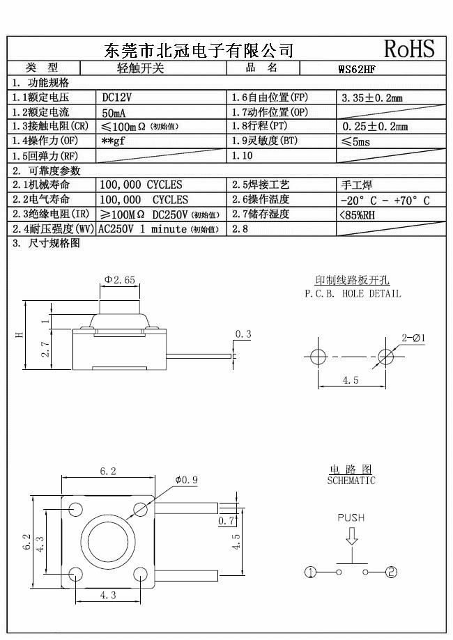 3.Lnsulation Resistance: ≥100mΩ DC250V