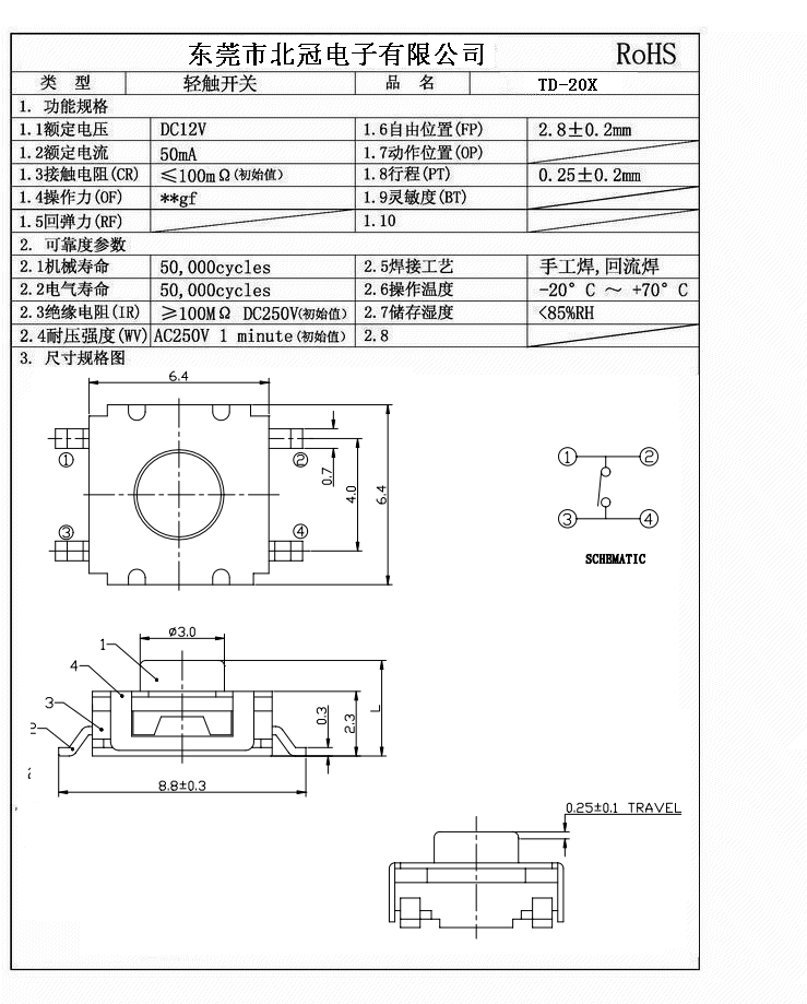 TD-20X輕觸開關的尺寸為:長6.2mm*寬6.3mm,高3.4-5.1mm。6*6硅膠觸開關也可以稱之為電子煙開關,大量用于電子煙產品。此款為軟頭、U型四腳的輕觸開關,在美容器械、數碼產品等行業也廣泛使用,具體產品如電子煙、耳機、血壓計、按摩機等。
