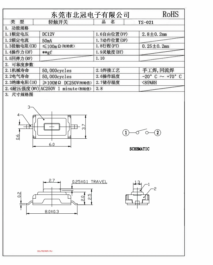 輕觸開關TS-021,市場上又稱為:3*6*2.5貼片輕觸開關,3*6拉心輕觸開關,產品可過回流焊240度高溫時間.此款輕觸開關的驅動力度有160克力和250克力兩種標準,按鍵的顏色有紅色和白色兩種款式,產品的包裝方式分為:袋裝(1000PCS/包)和卷裝也就是編帶(3000PCS/盤)兩種類型