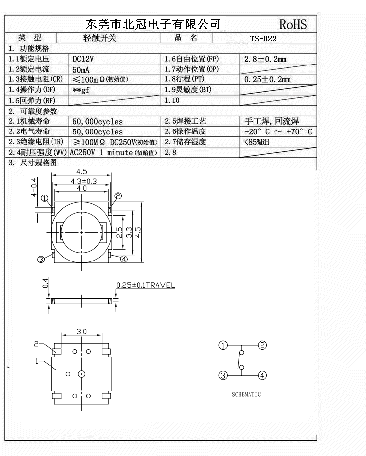 3.Lnsulation Resistance: ≥100mΩ DC250V