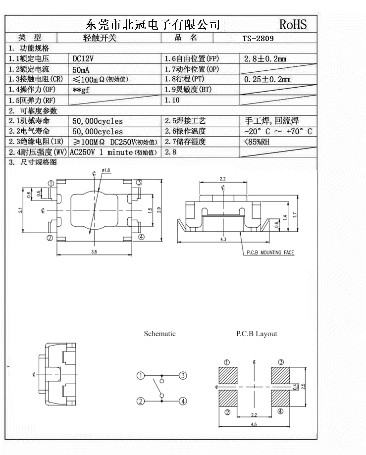 產(chǎn)品名稱:TS-2809輕觸開(kāi)關(guān)