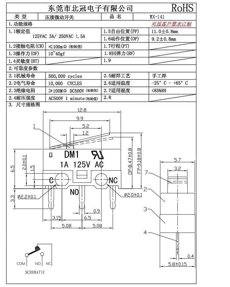 3.Lnsulation Resistance: ≥100mΩ DC500V