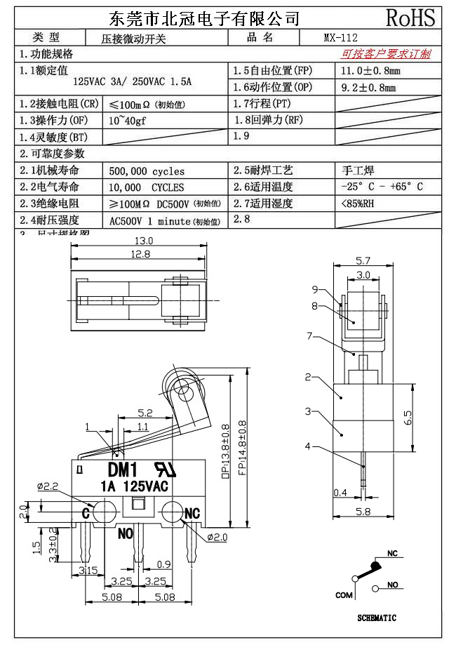 3.Lnsulation Resistance: ≥100mΩ DC500V