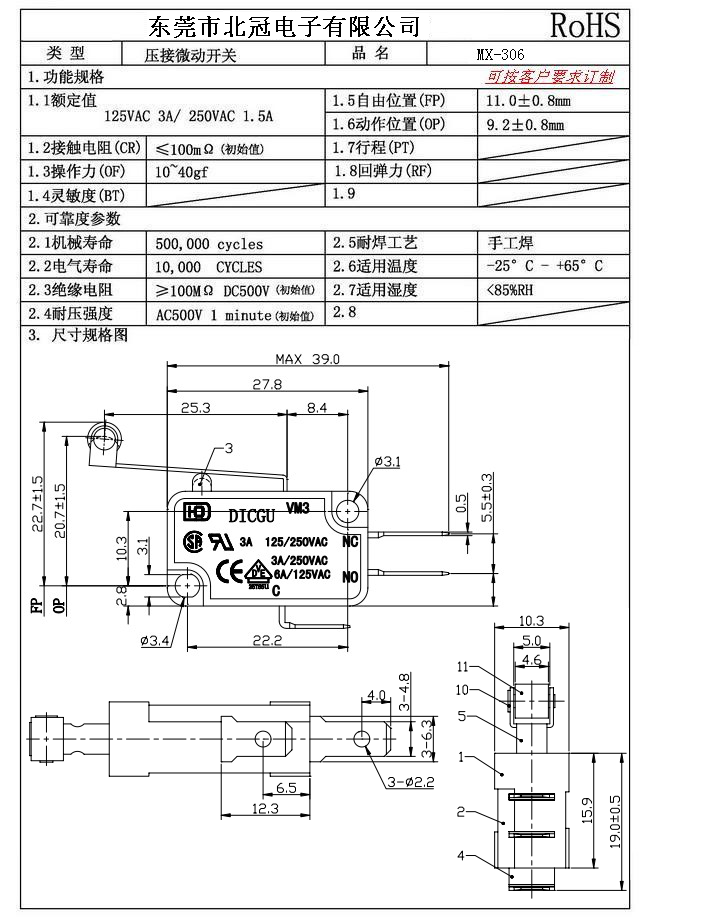 7.Operating Force:30±10gf